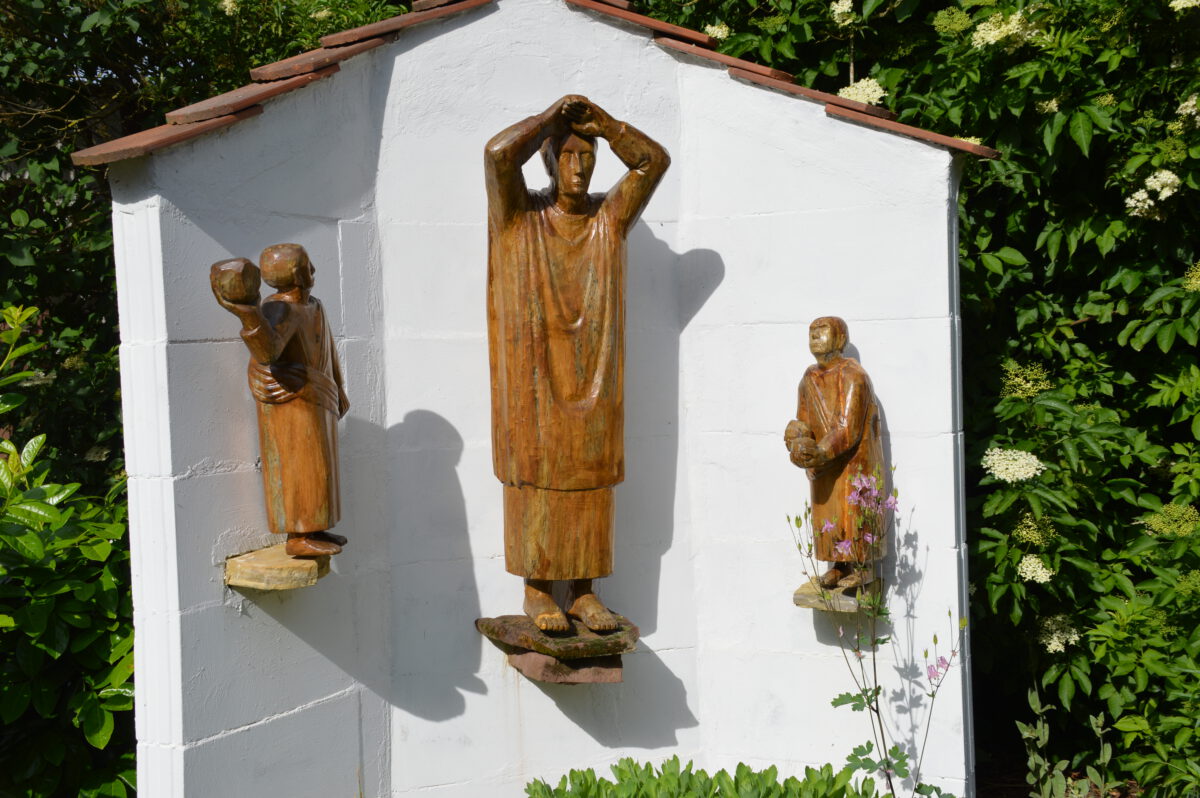 - „Wer von euch ohne Fehler ist, der werfe den ersten Stein“ – eine Holzfigurengruppe